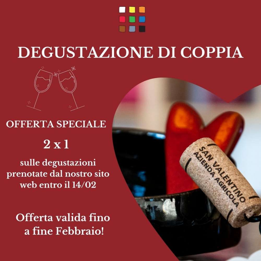 Avrete il 2x1 sulle nostre degustazioni, che potrete prenotare dal nostro sito web https://www.vinisanvalentino.com/it/visite-e-degustazioni inviando richiesta con note: Offerta San Valentino.